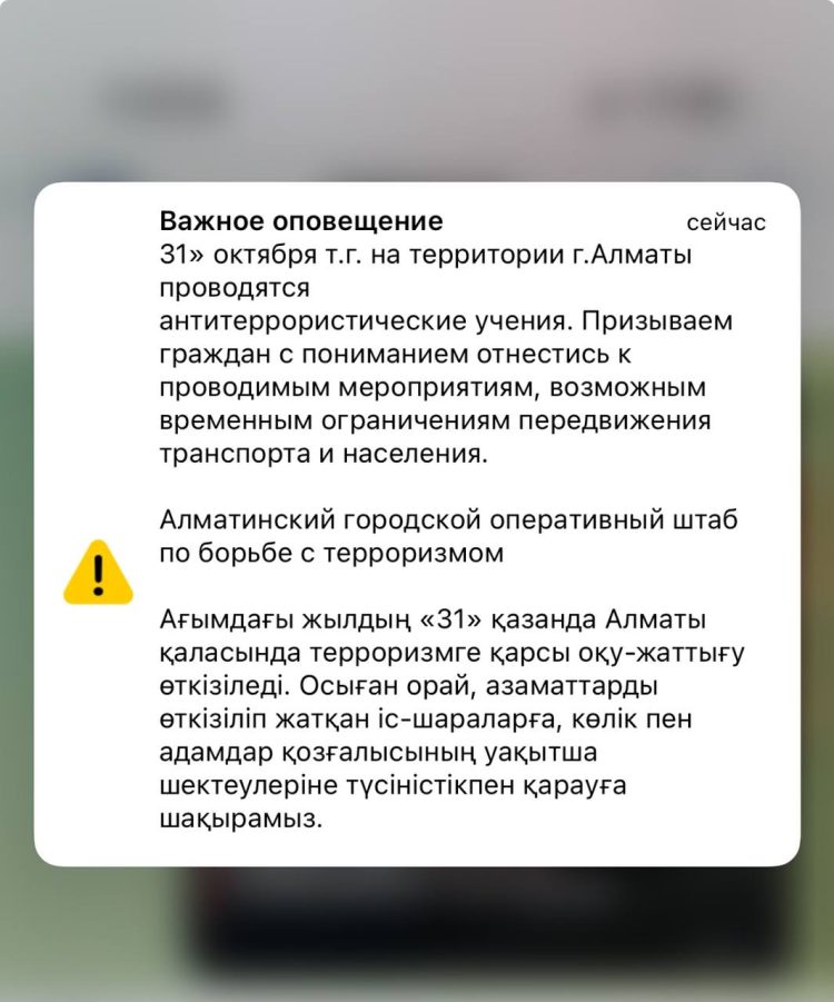 В 11 утра большинство алматинцев получили на мобильные телефоны экстренное оповещение, сообщает alataunews.kz.