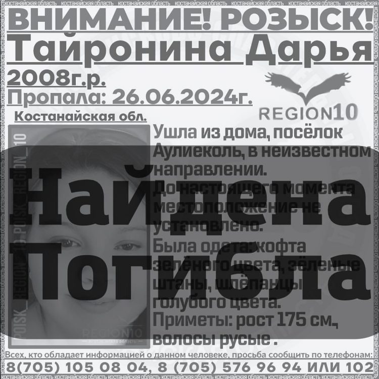 Девочка ушла из дома в посёлке Аулиеколь 26 июня в неизвестном направлении и пропала. Два дня ее искали полиция и волонтеры. 28 июня девушку нашли мёртвой.