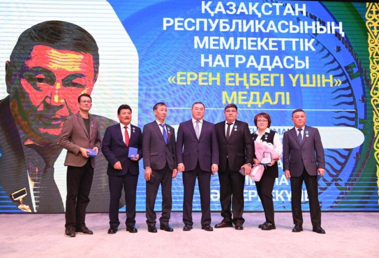 Медаль «Ерен еңбегі үшін» была вручена четырём специалистам: скотнику крестьянского хозяйства «Мырзағали» Нурболу Жумабеку, директору ТОО «Alma Prodex» Калиахату Ускимбаеву, генеральному директору ТОО «Алатау Кұс» Жанне Курмашевой и директору Кегенского лесного хозяйства Айболату Солтангазиеву.