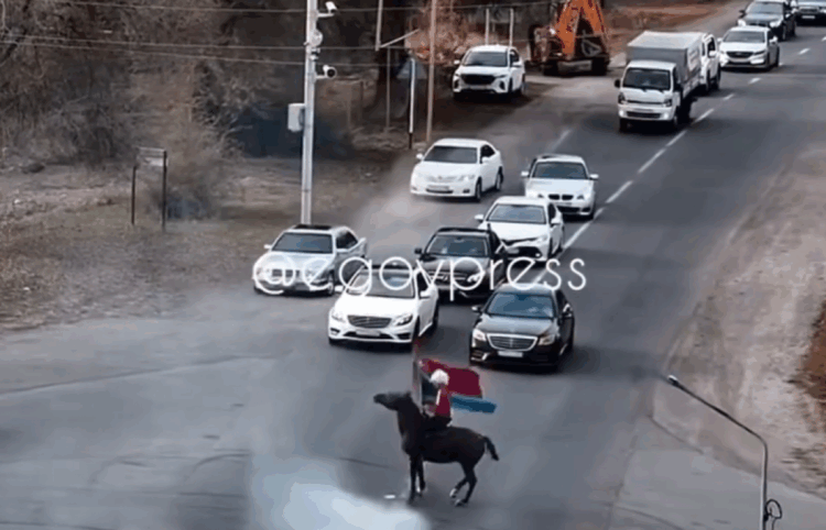 В социальных сетях появилось видео, на котором несколько автомобилей перекрыли дорогу. В центре проезжей части — мужчина на лошади с флагом в руках, рядом два автомобиля выполняют дрифт.