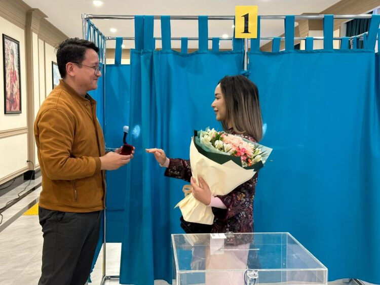 «Сегодня исторический день для нашей страны. Каждый гражданин делает свой выбор относительно будущего страны. Мы также приняли важное решение относительно нашего будущего. Именно поэтому я хотел сделать предложение сегодня», — сказал жених Бакытжан.