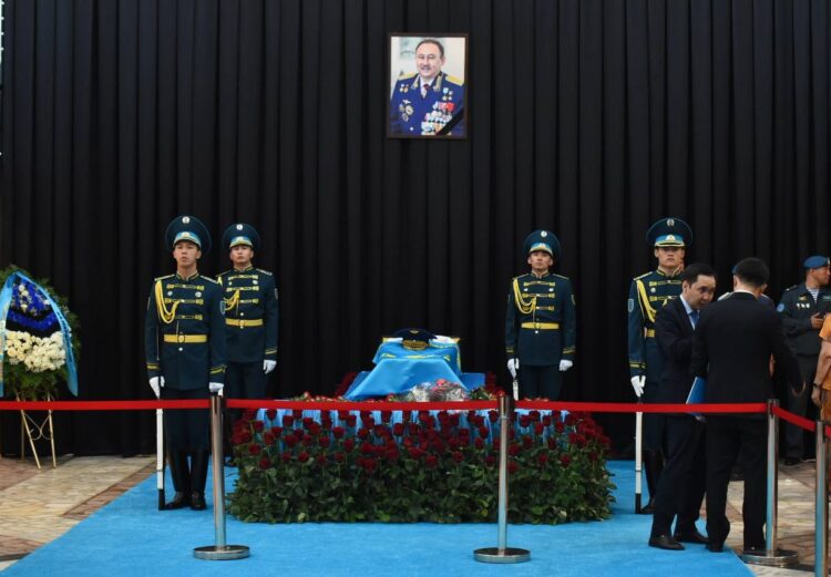 Присутствуют члены семьи, родственники, сослуживцы, знакомые, а также представители государственных органов и общественности. Среди них — председатель маслихата Отыншиев Меиржан, космонавты Токтар Аубакиров и Айдын Аимбетов, депутат Мажилиса Азат Перуашев, председатель Совета генералов Алматы Сарсеков Бексултан.