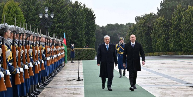 Құрмет қарауылының бастығы екі ел басшыларына рапорт берді. Қазақстан мен Әзербайжанның мемлекеттік әнұрандары шырқалғаннан кейін Қасым-Жомарт Тоқаев пен Ильхам Әлиев бір-біріне ресми делегация мүшелерін таныстырды.