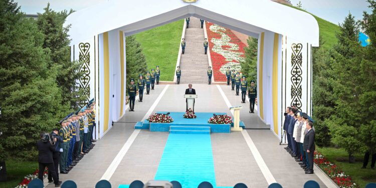 «Биыл жауынгерлеріміз бітімгерлік миссиясын көк байрақтың астында тұңғыш рет дербес орындап келді. Азаматтарымыздың, мемлекетіміздің осындай жетістіктері Қазақстанның қуатты әрі жасампаз ел екенін көрсетеді. Мемлекеттік рәміздер – ел мақтанышы. Елтаңбамыз, көк Туымыз бен Әнұранымыз әр азаматтың жүрегінен ерекше орын алады. Бұл – нағыз отаншылдық белгісі. Ұлт нышандары – халқымыздың болмыс-бітімінің айнасы, жарқын болашағымыздың кепілі», – деді Мемлекет басшысы.